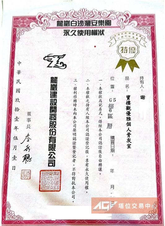 龍巖白沙灣安樂園 真龍殿骨灰室 (個人自售)