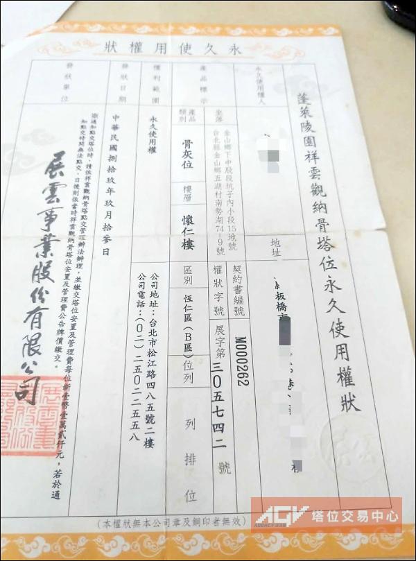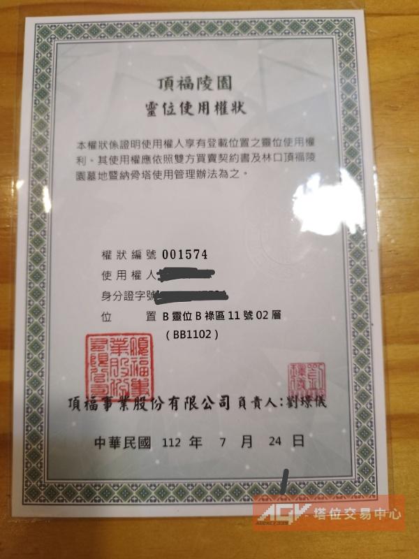 吉祥型塔位 ( 前後放 夫妻可放2人 ) 不含永久管理費 及 過戶費用