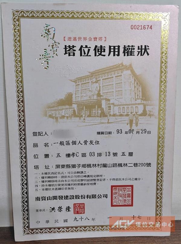 吉祥型塔位 ( 前後放 夫妻可放2人 ) 不含永久管理費 及 過戶費用