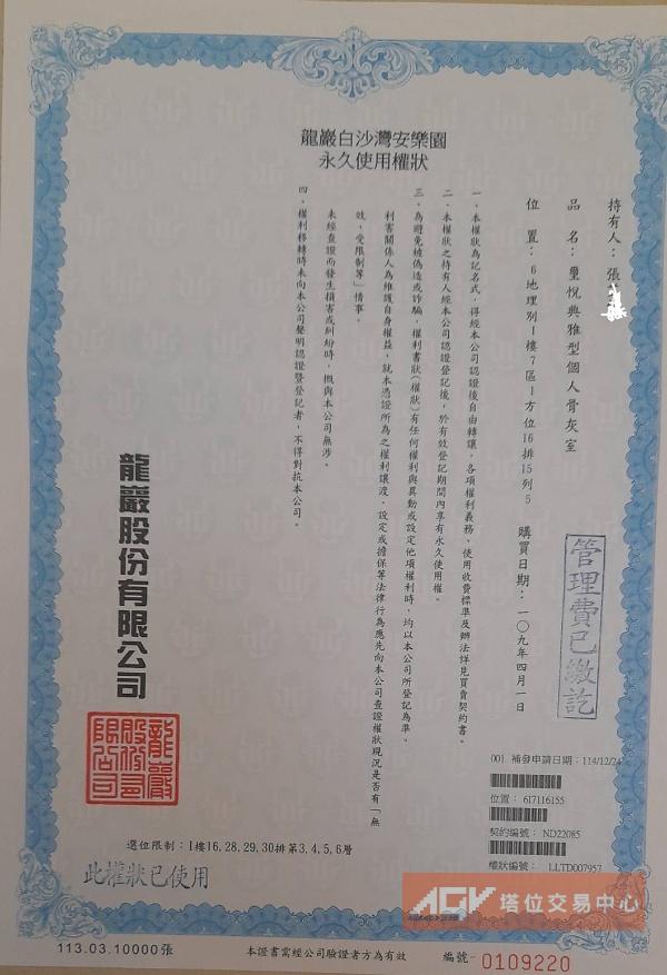 真龍殿18樓璽悅典雅型個人骨灰室第5層