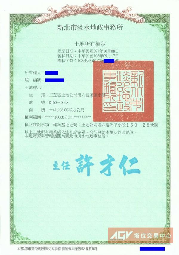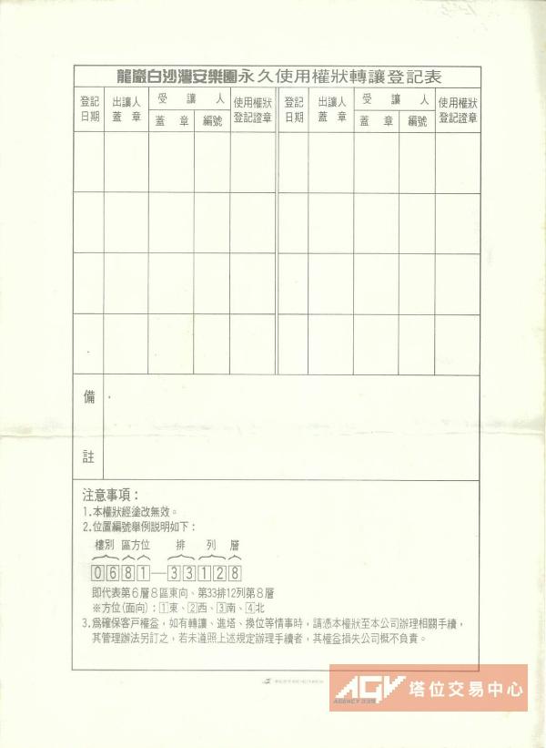 自售(已選位 7萬5千 全包)白沙灣安樂園 個人骨灰塔位使用權狀 真龍殿五樓 座東面西 第八層