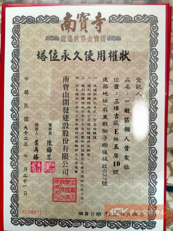 自售(已選位 8萬全包)白沙灣安樂園 個人骨灰塔位使用權狀 真龍殿五樓 座東面西第八層 仲介勿擾