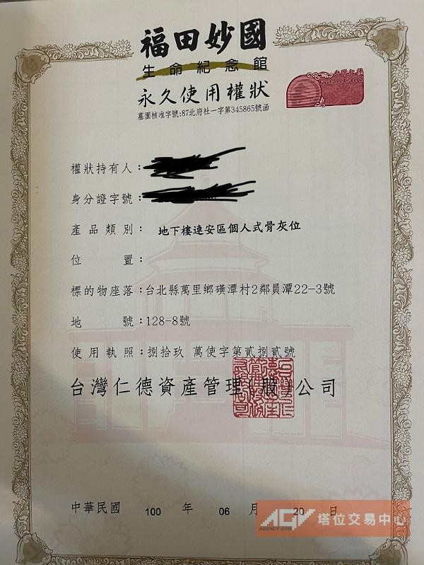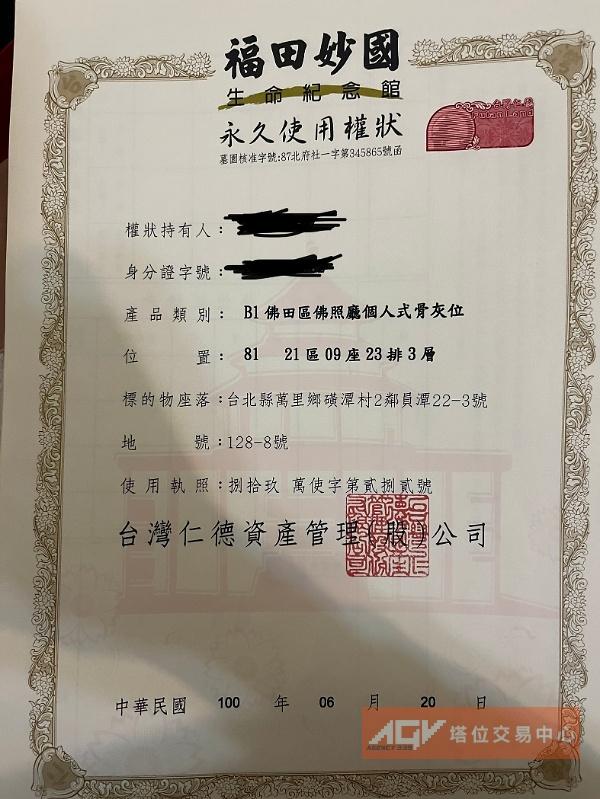 三芝墓園個人塔位9樓雨珠館
