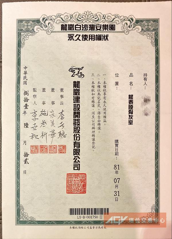 [自辦轉讓] -三芝龍巖真龍殿-個人位-全新未選位
