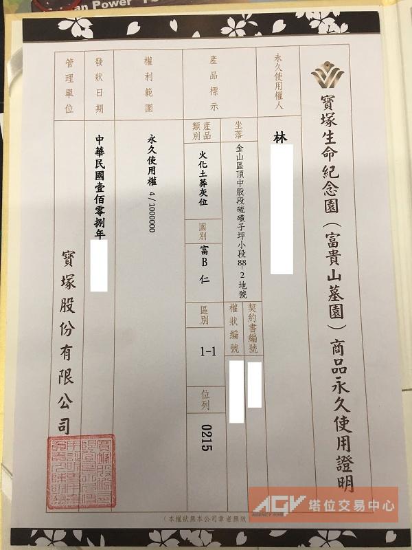 塔位出售-寶塚生命紀念園(富貴山墓園) 火化土葬灰位 (個人)